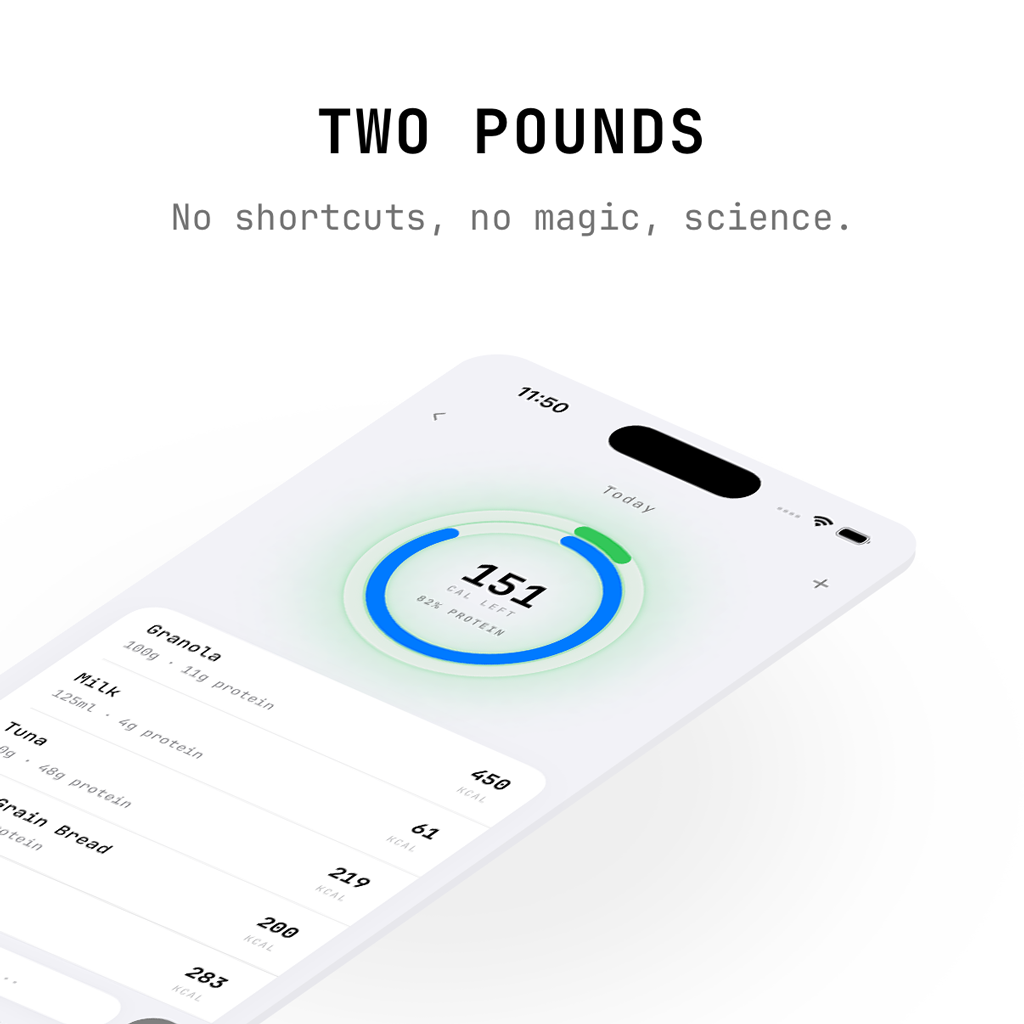 Two Pounds uses the Mifflin-St Jeor equation to calculate your TDEE, then applies a 500 Cal deficit — the clinically supported rate for losing up to 1 kg per week without losing muscle. The rest is up to you.